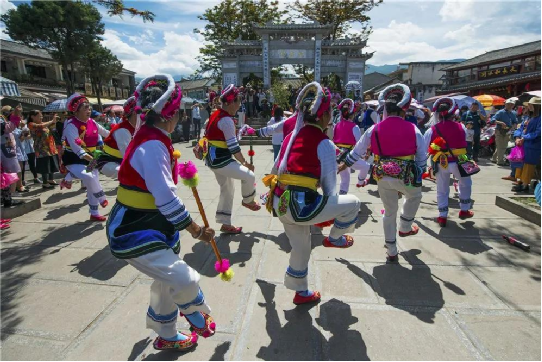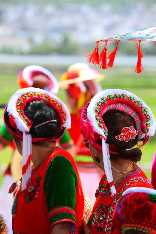 在白族女子的包頭頭飾上,蘊含著一個大家非常熟悉的詞語:風花雪月。垂下的纓穗象征下關的風,艷麗的花飾象征上關的花,帽頂的潔白是蒼山雪,彎彎的造型是洱海月,足見白族群眾的精巧靈思。