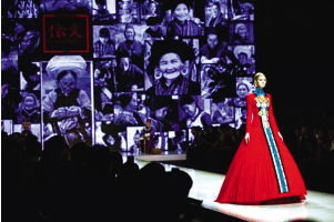 在活動現(xiàn)場,隨著一曲旋律優(yōu)美、委婉動聽的布依歌謠《穿上阿媽的繡花衣》,4位布依族繡娘唱著古老的歌謠走進(jìn)秀場。她們安靜地坐在舞臺上飛針走線,以嫻熟的繡藝做起了日常的針線活。45套以中國刺繡元素為設(shè)計靈感的EVE CINA時裝、24套國金黃金股份有限公司專題設(shè)計的中國元素配飾逐一呈現(xiàn)在觀眾面前。秀場上演了一場東方時裝之美的視覺盛宴。