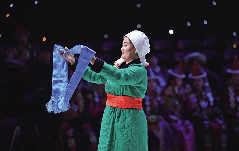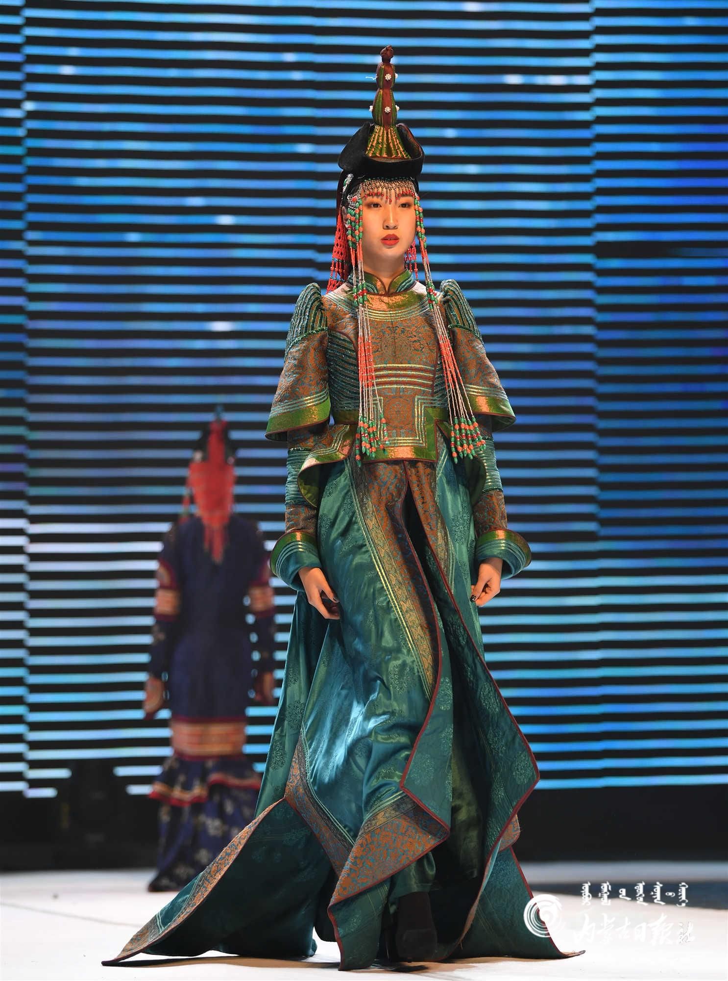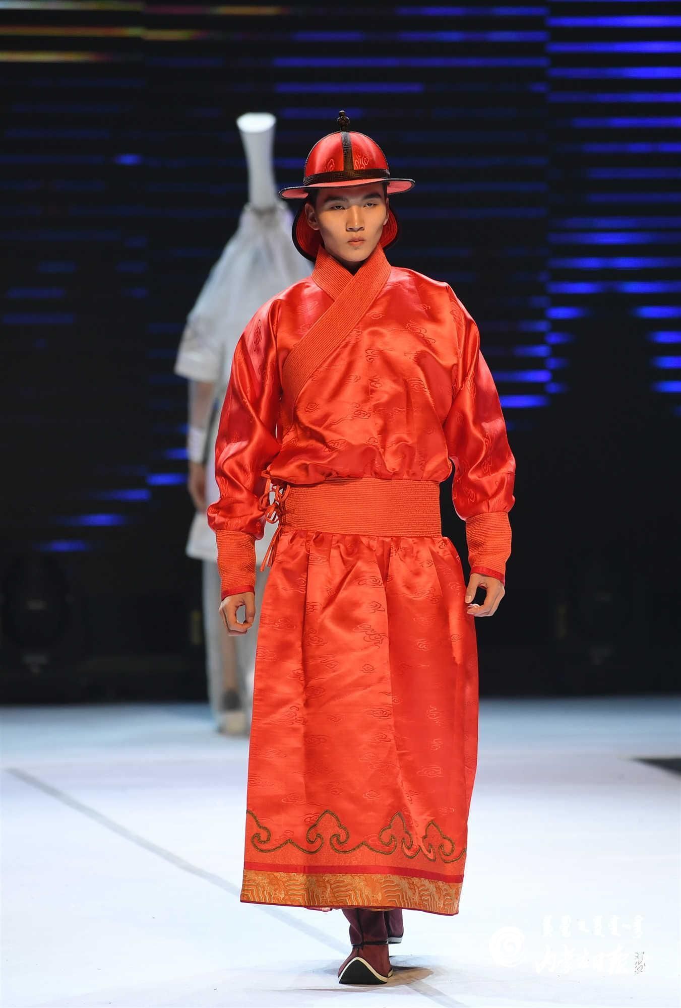內(nèi)蒙古藝術(shù)學院的學生在舞臺上展示蒙古族禮服。