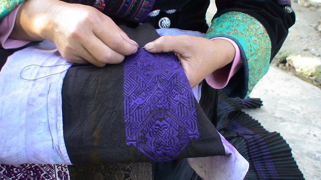 服裝的挑花刺繡均是依照布料的經(jīng)緯戳針,在繡法上多有變化,如平繡、數(shù)紗繡、織繡等,其紋樣層層疊套,圖案工整對(duì)稱(chēng),其繡技與織技完美統(tǒng)一,巧奪天工,具有很強(qiáng)的立體感。體現(xiàn)了苗族獨(dú)特的正挑反針挑花、刺繡、織繡等精湛工藝。