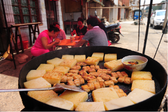臭豆腐是平壩街的特產(chǎn),一直享譽(yù)滇東南。特別是在文山更是家喻戶曉。它火柴盒般大小,表皮長滿一層白白的絨毛。若是蒸吃,先揀幾塊鋪在碗底,再撒撮鹽巴,放點食油,加些姜絲,放進(jìn)蒸鍋蒸熟。吃前用筷子攪和拌勻,看上去雪白,細(xì)嫩,宛若剛出籠的銀糕玉乳,散發(fā)出誘人的馨香。若用油煎,先將菜油舀進(jìn)鍋里,待鍋熱時,立即放進(jìn)臭豆腐。隨著“嗤”的一聲,香味立時撲鼻而來,再用小火耐心地將兩面煎黃,薄薄的黃皮內(nèi)含著一包乳漿??戳司妥屓舜瓜延?。