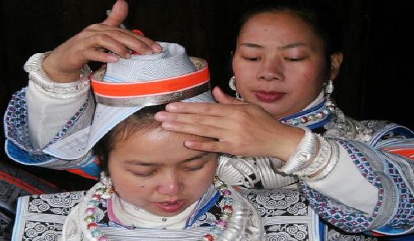 圖為革家姑娘在接請(qǐng)姑媽過“十四”前,母親總要為女兒作一番打扮