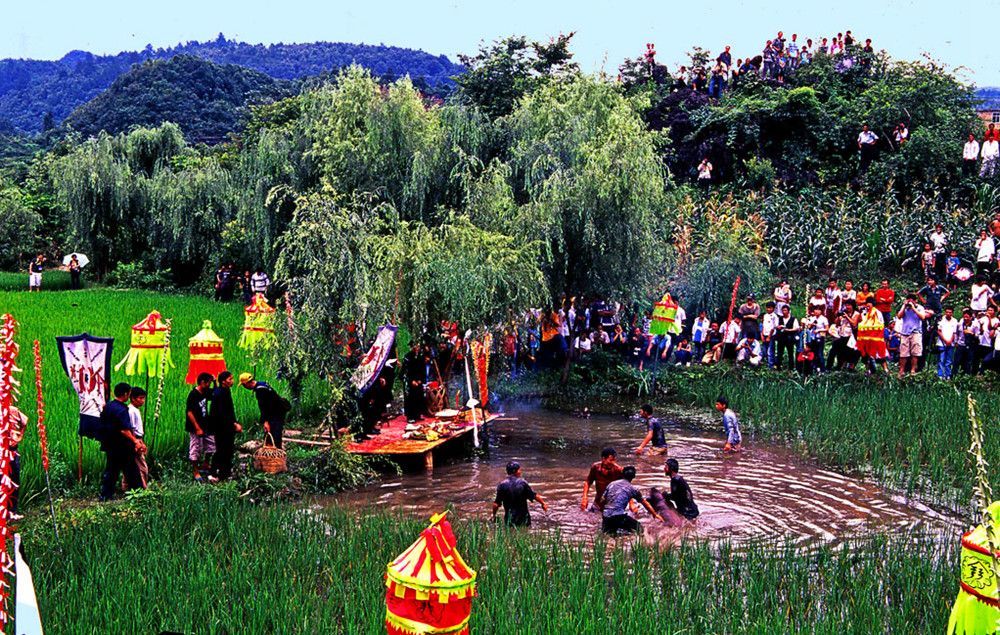 敬霞儀式在霞堂舉行。霞堂設(shè)有祭壇。壇前立著一根竹竿,竿頂上站立一只公雞。祭壇中是主祭席,其友有用松針鋪成十二個祭祀點,由宗族各支系擺設(shè)祭品。敬霞這天,各支系由德高望眾者領(lǐng)隊。抬著豬肉、糯米飯、米酒等食品列隊進(jìn)入霞堂。一路上銅鼓、銅鑼、欽、革鼓被敲得冬嚏冬嚓地響,人們跟在后面吆喝著前進(jìn)。祭典開始,鑼鼓暄天。接著由執(zhí)壇的水書先生念讀敬霞的祝詞,內(nèi)容多為祈福禳災(zāi),期冀風(fēng)調(diào)雨順,人壽年豐之類。祝詞之后便酪酒祭之:此后,由兩個身穿白衣的小伙子抬一母豬到田壩中繞行,后面那位不時用松針刺戳豬的尾部,使它發(fā)出嗥叫聲。圍觀的人常常發(fā)出哄笑,并且盡情地用竹片屏水和撮稀泥向抬豬者灑淋過去。走過霞堂之后,抬豬者丟下母豬,故意穿進(jìn)圍觀的人群,嚇得人們四處躲避。這種逗趣結(jié)束之后,水書先生再度念讀咒詞,當(dāng)他手中的執(zhí)法彩杖一揮時,飼雞者便學(xué)雞嗚,逗引竹竿頂上的公雞啼鳴。這時,主祭者就向眾人高呼:等待霞神降雨來沐浴。此后,水書先生再念祝詞,又酹酒祭之。然后由各族系代表抬著"酒壇去澆灌"霞神"。人們用酒從頭澆到腳,一直澆到"霞神"們倒(象征酒醉)才算祭祀的成功。