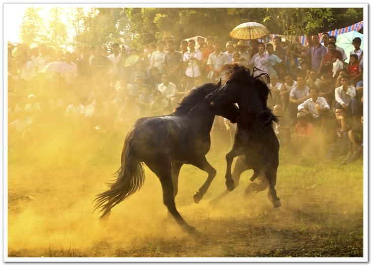 斗馬時,先牽出一匹年輕母馬到場作媒介挑逗公馬,出場的兩匹公馬都想親近母馬,由此引發(fā)一場決斗。誰都想打敗對方而占有母馬,都使出渾身解數(shù),酣戰(zhàn)不止,直至決出勝負。