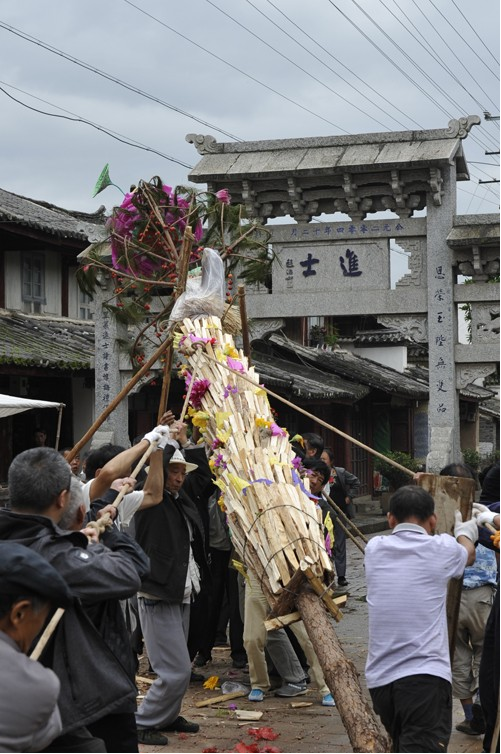 在劍川,都是由家里喜添子嗣的人家來籌備火把節(jié)的一切事宜,除了對新生兒的祝福,火把樹的裝扮也表示劍川人祈愿風(fēng)調(diào)雨順,人壽年豐、鄰里和諧?;鸢岩樱ㄩc年要扎十三層),上面六層的明子和柴分別由細(xì)到粗,一層接著一層,下面七層都是一樣的新柴。喻示每一個新的日子都紅紅火火。