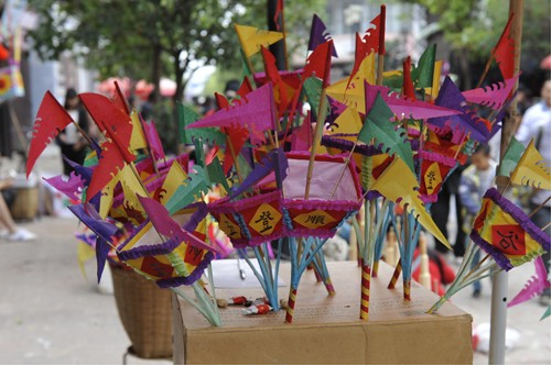 早上十點(diǎn)左右,火把就快扎好了。色彩鮮艷的紙裱斗升上各色卷著的彩旗正一個個被打開,梨、蘋果、花紅正被栓成一串串地掛在樹枝上,水泥桌上擺著小旗、炒蠶豆和糖果等,老人們在一旁邊笑邊聊,一盤彩色米干在燦爛的笑著。