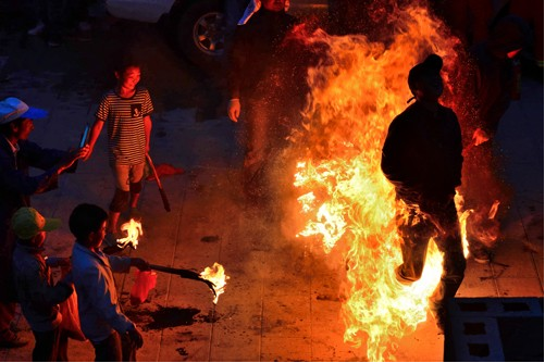 不到黃昏,鞭炮聲就響起來了。新生兒的父親點(diǎn)燃火把后,孩子們迫不及待地拿著小火把和松明粉,跑來跑去燒新生兒的的各種親戚,大人們樂呵呵地接受孩子們噴灑過來的火焰,并一致說著很吉祥的祈愿祝福語。“從此晦氣不在嘍!”、“一年更比一年好呀!”、“紅紅火火又一年”。男女老少在火把樹下吃喝玩樂,其樂融融。糖、炒蠶豆、梨、蘋果等被大家傳來傳去,新生父親挨個向親友敬酒。親友鄰居喝著喜酒,一致祝福新生兒安康成長,將來富貴吉祥。