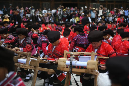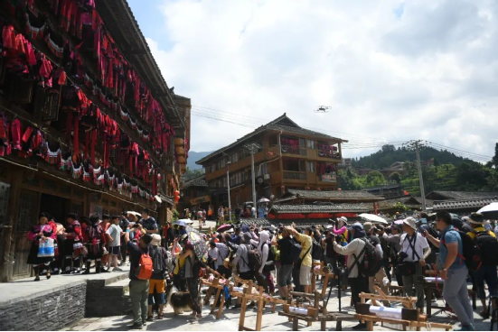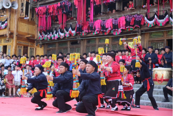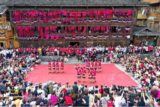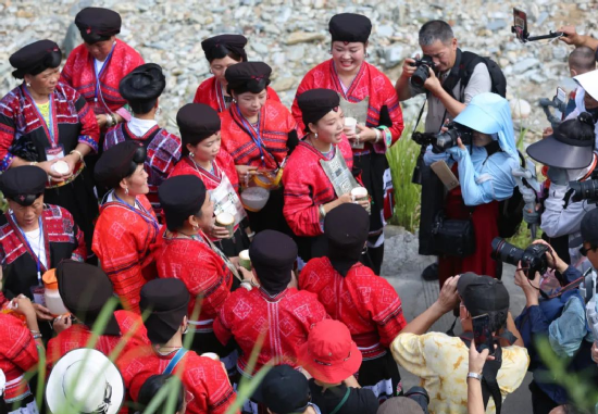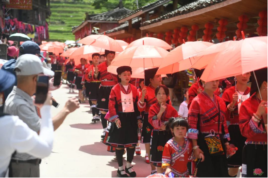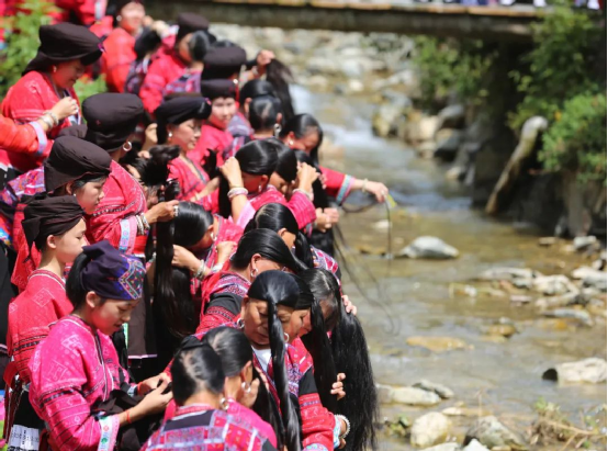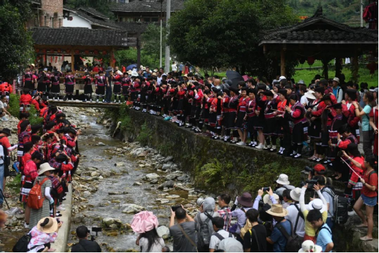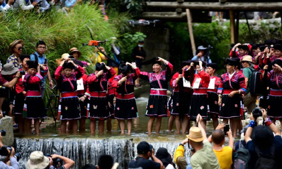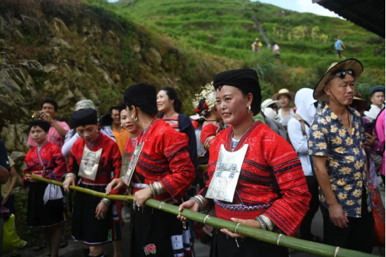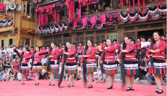 曬衣節(jié)當(dāng)天還進(jìn)行了嗩吶鑼鼓迎賓、瑤嫂長發(fā)梳妝展示、“抬金狗”送祝福、紅瑤服飾加工展示、紅瑤集體婚禮等活動(dòng),豐富多彩的民俗文化、濃郁的民族風(fēng)情,讓各地游客流連忘返。