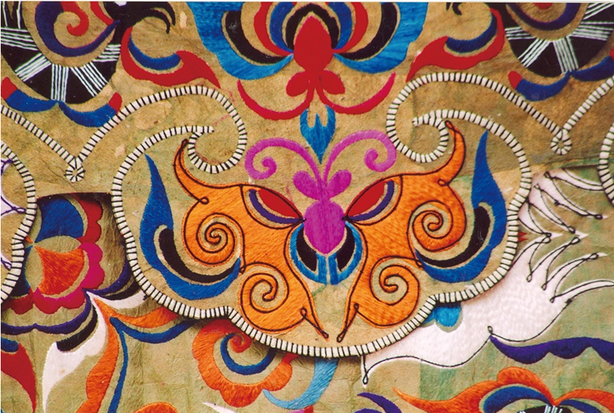 在苗族各種工藝的服飾圖案中,蝴蝶是俯拾皆是的,而丹寨縣雅灰鄉(xiāng)和榕江縣高排鄉(xiāng)等地的苗族百鳥衣上,大面積地使用絲帛和絲線刺繡,常在中心位置繡著一種奇特造型的動物圖案,頭是變形的鳥頭,身是蟲身,有節(jié),周圍是飛舞的蝴蝶。不少人解釋它為龍。其實那是蠶蟲、鳥、蝴蝶的結(jié)合:蝴蝶——鳥——蠶蟲——一幅圖本身就包含了蝴蝶圖騰的全部寓意。
