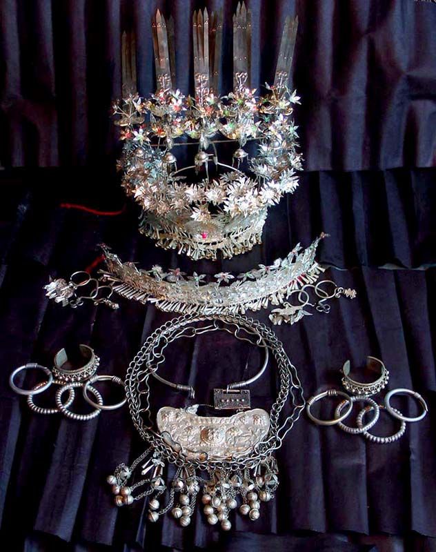 據(jù)苗族古歌傳唱,早期的苗族銀飾以胸飾、手飾為主,其中胸飾由冷兵器時(shí)代的護(hù)心鏡演變而來,手鐲最初是巫術(shù)中的兒童辟邪之物。后來,由于不同苗族支系文化的相互滲透,用于服飾裝扮的內(nèi)容和形式逐漸豐富,遂演變成現(xiàn)在豐富多彩的苗族銀飾。