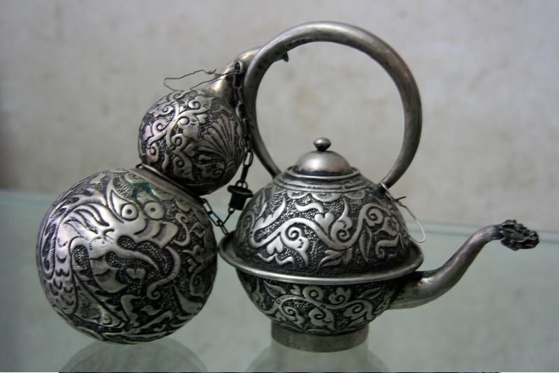 銀飾造型通常以龍、虎、牛、馬、鳥、昆蟲、花卉等動(dòng)植物圖案為元素,經(jīng)過溶銀、錘片、拉絲、鑄模、做花、絞絲、編花、焊接、洗花等多道工序完成。成型的銀飾在最后一道工序中,需放入硼砂與火硝的混合液中浸泡,再高溫烘干并加熱至紅色,然后再放入明礬水中洗滌,去除污物和雜質(zhì),即可生成銀金屬特有的質(zhì)感和光亮。劍河苗族銀飾工序繁復(fù),技藝精湛,造型栩栩如生,成品精美絕倫。
