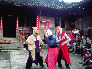 土家族陽戲在貴州、湖南、重慶等省、市都有流傳,湖南省張家界陽戲和重慶酉陽陽戲均被列入了省級非物質(zhì)文化遺產(chǎn)名錄,得到保護(hù)和重視。貴州沿河土家族自治縣的土家族陽戲同樣古樸而充滿風(fēng)韻,5月19日,當(dāng)?shù)氐囊慌幕ぷ髡邤M通過挖掘整理,把獨(dú)具地方特色的面具陽戲申報(bào)為省級非物質(zhì)文化遺產(chǎn),希望沿河陽戲同樣受到重視和保護(hù)。