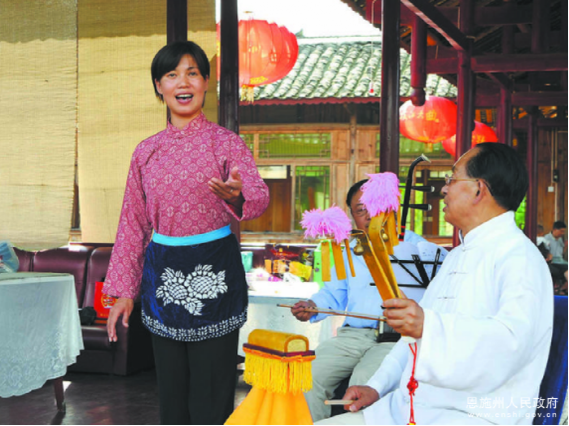 伴奏樂器因表演方式不同有所區(qū)別,拉場賣唱的樂器有三挑板和竹鼓,唱雅曲的有三挑板、梆鼓、大筒筒、打琴,演唱現(xiàn)代曲目時又加入了竹笛、二胡、琵琶、大提琴等樂器。