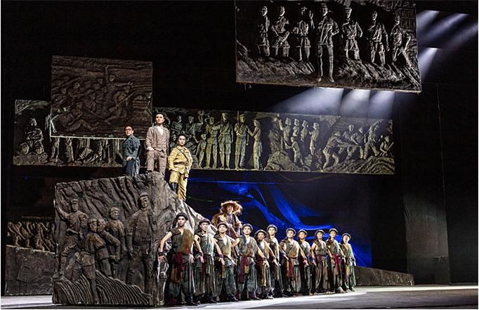 在舞蹈語言的設(shè)計(jì)上,編導(dǎo)融入當(dāng)代元素,使觀眾不但感受到審美的親切與現(xiàn)代感,而且還自然地進(jìn)入回望歷史的情境,對(duì)其思想內(nèi)涵的理解更為準(zhǔn)確。該劇的道具使用和調(diào)度也頗為大氣,令人印象深刻。一組斜坡狀的大型舞臺(tái)道具不但由群眾演員直接移動(dòng)而實(shí)現(xiàn)即時(shí)的場景調(diào)度,還可使演員上下和左右而行,最終組合成巨大的中國共產(chǎn)黨黨徽,輔助完成了人民英靈和英雄的形象塑造。