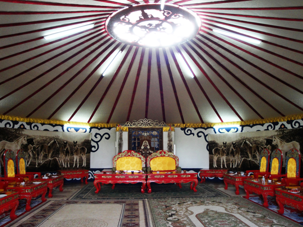 早先,蒙古人逐水草遷移,以氈帳為居室,所以蒙古人對(duì)制作氈帳有很高的技術(shù)。當(dāng)?shù)啬撩竦臍謳び冒酌珰指采w,毛氈上面涂以石灰或白粘土和骨粉,使之更為潔白,有時(shí)也把毛氈涂成黑色。覆蓋在天窗周圍的毛氈,飾以各種圖案,門口懸掛著繡有各種顏色圖案的毛氈。大汗及諸王的氈帳則涂上金色,舉行宴會(huì)的氈帳可容納2000人。金帳之稱謂也由此而來【老鐵供圖】。