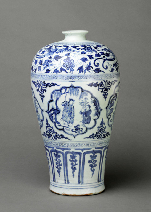 裝飾繁密是典型元青花的重要特點(diǎn),它們由細(xì)巧的文化組成若干條帶環(huán)繞器身,裝飾帶數(shù)量通常很多,但惟獨(dú)沒有7層的,因?yàn)檫@個(gè)數(shù)字和蒙古族的喪葬與元代的刑罰有關(guān)。相反,9層裝飾帶的元青花卻為數(shù)不少,而這與蒙古族重九顯然有著直接的聯(lián)系【圖為元代后期青花四愛圖梅瓶。湖北省博物館藏】。