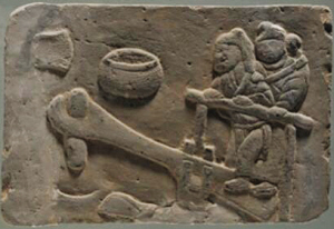 長31厘米,寬19厘米,厚5厘米,呈長方形。生動(dòng)刻畫了一個(gè)推磨的場景。磨的一端為一婦女,一端為一小男孩。婦女頭梳圓形發(fā)髻,身著長裙、短上衣系長帶,雙手握推杠于胸前,眼睛注視著推杠另一端身高不及杠的小孩。小孩全身裸露,背朝外,頭向上昂起,看著高過頭頂許多的推杠,雙手作吃力地推杠狀。整個(gè)畫面將母子二人推磨時(shí),母親憐愛孩子的情景淋漓盡致地表現(xiàn)出來。