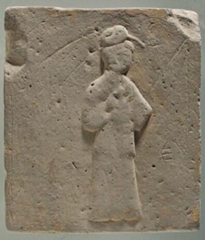 長30厘米,寬26.5厘米,厚4.5厘米,呈長方形。畫面中央刻有一位仕女形象。仕女儀態(tài)端莊,發(fā)髻高高盤起,衣著長裙,雙手抱著一個(gè)長柄執(zhí)壺,輕移蓮步,徐徐向前,像是要給遠(yuǎn)道而來的朋友斟上一杯家釀的美酒。