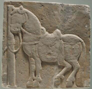 邊長30.5厘米,厚5厘米,呈正方形。配有鞍具和轡具,韁繩系在拴馬柱上。馬取立姿,似在歇息。馬首微頷,雙耳直立,頸部粗壯,身體肥碩,前腿挺直,后腿微曲,長尾及地。雕刻手法簡練,平實(shí)而質(zhì)樸。