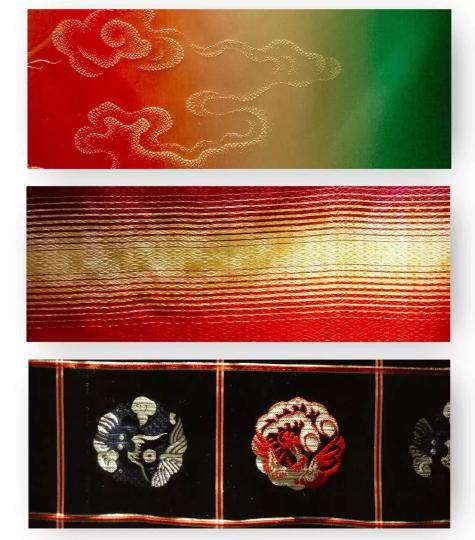 民族錦一般采用多色彩條嵌入金銀絲織成,多用于民族服飾,故名。其特點是錦面上的圖案從經(jīng)緯線交織中顯現(xiàn)出自然光彩,富有光澤。常見的圖案有團花、葵花、“萬”字“壽”字等。彩暈錦的特點是織紋華貴相映,明暗匹配,層次分明,并以色暈過渡,花紋絢麗多彩,別具一格。