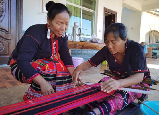西盟縣翁嘎科鎮(zhèn)班弄村農(nóng)家院子里,佤族老技藝手工織錦縣級(jí)傳承人娜龍正在教徒弟娜藥織布。