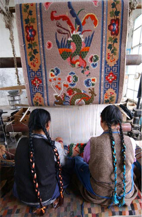 日喀則的江孜,是西藏地毯的重要產(chǎn)地。江孜有一種地毯,被稱為“卡墊”。 江孜卡墊紡織精密,經(jīng)久耐用,花紋富有民族傳統(tǒng)特色,顏色鮮艷奪目,已有900多年的歷史。在明清時期,江孜卡墊是西藏地方政府官員向朝廷進貢的主要貢品。