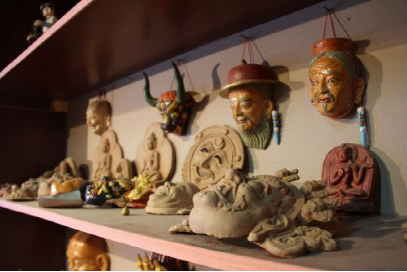 在普布次仁所在的公司里,有一個專門用來制作泥塑面具的房子,從外表上看去,它只是一個普普通通的藏式民居,但走進其中,則別有一番天地。在房間里整齊擺放了大大小小的泥塑面具、佛像,這些手工藝品造型生動,每一件手工藝品仿佛都在訴說著一個古老、動人的故事。