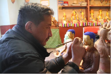 邊巴在對泥塑佛像上色。