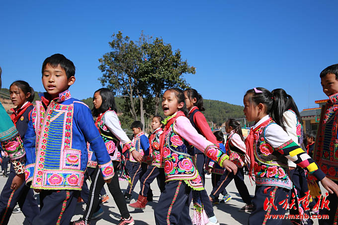 伴隨著三弦琴悠揚的旋律和整齊的舞步聲,我們走進云南省楚雄市大過口鄉(xiāng)中心民族小學(xué)校園,映入眼簾的便是身著彝族服裝的老師和學(xué)生們,他們在操場上圍成了三個大圓圈,用彝語和漢語歡快地唱著跳著。進入大圈里,近距離看著手捧三弦琴的高年級同學(xué),還有那些奮力吹著葫蘆笙的男同學(xué)們,別有一番氣勢。而那些圍成兩個小圈的低年級學(xué)生們,在陽光下邊唱邊跳彝族三弦舞,青春的朝氣蕩漾開來。