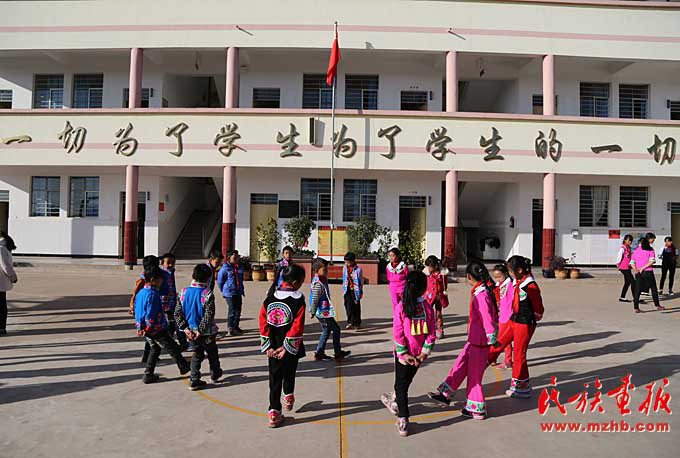 看過臘灣民族小學(xué)課間操的人都會說:“臘灣民族小學(xué)的課間操都是跳出來的?!比欢?,對于這所雙語教學(xué)的民族小學(xué)來說,其民族特色遠不止于此。穿彝族傳統(tǒng)服裝、講彝語也是這里的教育特色。