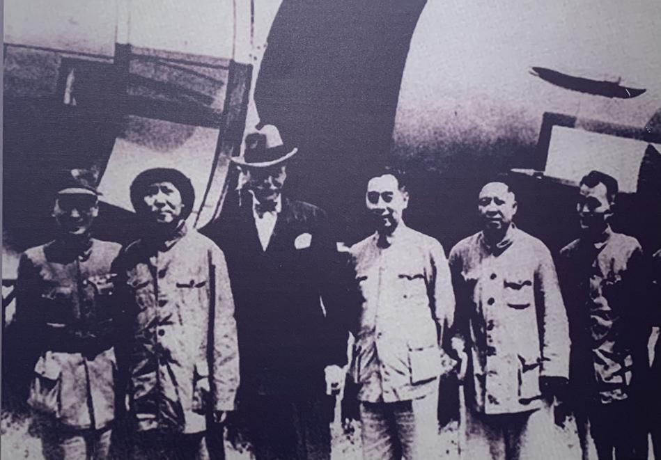 1945年,中共代表團(tuán)在赫爾利(美國駐中國大使)、張治中的陪同下臨行前在延安機(jī)場合影,左起為張治中、毛澤東、赫爾利、周恩來、王若飛、胡喬木。(許覬佳攝于貴陽市達(dá)德學(xué)校舊址)