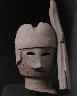 埴輪,為日本特有的器物。埴輪放置在古墳封土表面,即為前方后圓墳中“方”的地方。埴輪分為筒形埴輪,來源于陶器;還有形象埴輪,細分為器物和人物。埴輪來源于中國古代墓室中陪葬的陶俑,或古代帝陵神道上的石獸石人。某些埴輪人物有文面,并填墨(圖十六),推測當時的日本出現(xiàn)了文面現(xiàn)象。