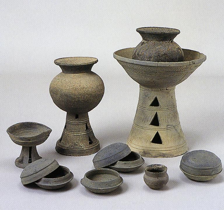 古墳時期另一種陶器為須惠器(圖十二),比土師器精美。它在古墳時代中期才從大陸引進而來,由朝鮮半島的“陶部”工人在相對集中的場所制作,采用輪制技術,器物呈青灰色,器形富于變化,主要為壺、瓶、盤、碗和高腳杯等。