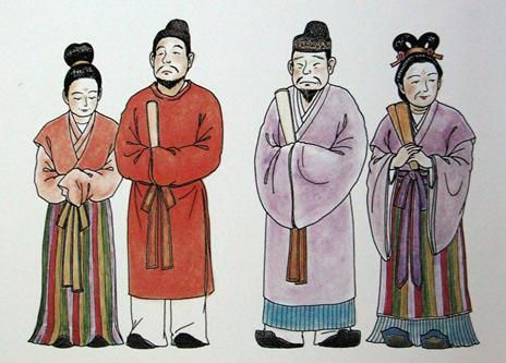 平城京內(nèi)人們所穿的衣服,和唐代服裝也一樣,男子為圓領袍衫,女子為間色裙。唐代因布匹幅面較窄,一條裙子用不同顏色布匹拼接而成,顧名間色裙,一般用六幅制成。腳穿木屐(圖二十三)。
