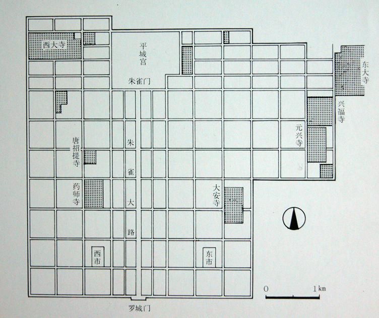 平城京在規(guī)模上繼承了藤原京,面積大致相同,東西約5.9km、南北約4.8km,其形制主要模仿唐長安城。全城平而呈長方形,宮城在北部中央。南面正中設象征性的都城正門——羅城門。羅城門與宮城的朱雀門相對,朱雀大路縱貫南北,全長約3.8km,寬72m。而此朱雀大路正好將全城分為東西兩部分,分別稱左京和右京。京城內(nèi)有里坊與商市(即東市和西市)。這些設置和街道的名稱都和唐長安一模一樣,但總體面積僅為唐長安城的四分之一(圖二十一)。