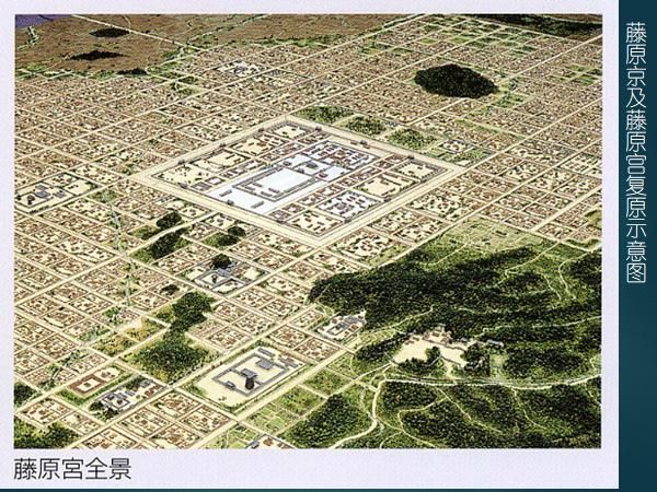 飛鳥-奈良時代對作為中央集權國家的象征的都城建設,極其重視。藤原京是持統(tǒng)、元明、元正三代天皇延用了16年的都城遺址,這個遺址經(jīng)過幾十年的考古發(fā)掘,已經(jīng)探明了藤原京和藤原宮的范圍及布局(圖二十)。京城東西及南北各長5.3km,平面近正方形,宮城在其中央,這點與唐長安城不同。有學者認為,藤原京是以《周禮》規(guī)定的理想化都城建制為依據(jù)所筑成的。
