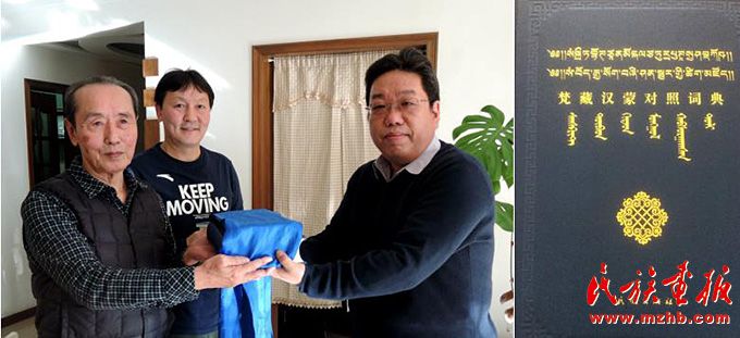 烏日根桑格(中)利用業(yè)余時間,與民族出版社蒙古文部原主任、資深編審卓日格圖先生(左一)合作出版《梵藏漢蒙對照詞典》。圖為向?qū)W者贈閱該詞典。