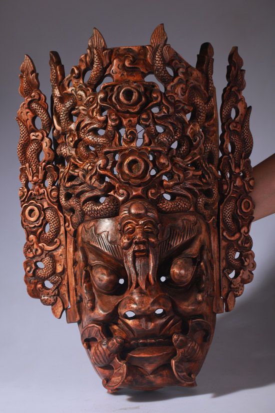 描述:程咬金,字義貞,原名咬金,后更名知節(jié)。驍勇善戰(zhàn),歷史上是唐朝開國名將,以“三板斧”的形象在民間廣為流傳。在地戲唱本《薛仁貴征東》和《薛丁山征西》中,均有程咬金的出場。根據《隋唐演義》的內容,程咬金雖然頭腦簡單,卻是個有福之人,被認為是福將,所以在地戲面具的刻畫上,在嘴角兩側雕刻上一堆蝙蝠,以取“?!钡闹C音。又因為程咬金在唐代算是長壽之人,故爾額頭上刻一壽星,帶給人福壽雙全的吉祥含義。