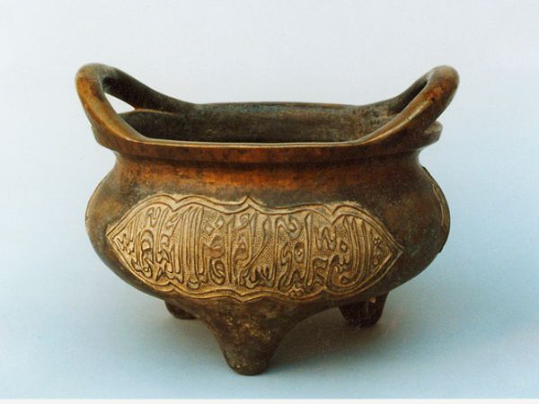 侈口、方唇、窄卷沿、矮束頸、扁鼓腹,口沿立一對(duì)橋形耳,底部以矮小的三乳足支撐整個(gè)爐身。外腹壁兩大兩小四組開光內(nèi)均以珍珠紋為底,陽(yáng)刻有阿拉伯文字,漢譯為:“最貴的記主詞(吉克爾)是念清真言(萬(wàn)物非主,唯有真主,穆罕默德是真主的使者)”,底款漢文四字篆書“宣德年制”。阿拉伯文構(gòu)成此爐的主體紋飾,圖案別致,內(nèi)涵深?yuàn)W,寓意獨(dú)特,雕刻手法精細(xì)、嫻熟,線條婉轉(zhuǎn)流暢,自然雅致,具有韻律之美。該器物銅質(zhì)精良,造型優(yōu)美,工藝考究,將冶鑄、雕刻技術(shù)與阿拉伯文書法絕妙融合,堪稱回族文物中的珍品。
