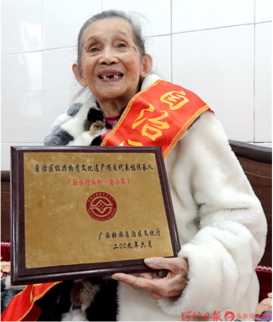 今年已經88歲高齡的“壯族打扁擔”技藝傳承人唐小琴,她從小即耳濡目染,跟村里老人、長者學習打扁擔,后因打扁擔需要指揮,又學習皮鼓打法。1961年4月,唐小琴從學校調入縣文化館任文化藝術輔導員,挖掘整理了《壯族打扁擔》《板凳舞》《斑鳩舞》等一大批傳統(tǒng)舞蹈,并多次在自治區(qū)、河池地區(qū)的比賽、調演上獲獎。1986年退休后,仍然致力于《壯族打扁擔》的傳承工作,2004年,組建都安縣老干康樂藝術團,帶動安陽鎮(zhèn)退休老人學習打扁擔技藝。2009年,她被確認為自治區(qū)非物質文物遺產項目“壯族打扁擔”代表性傳承人。