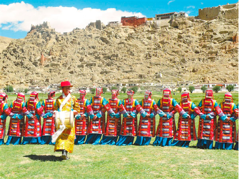 古格宣舞有“十三宣舞”之說。宣舞作為禮儀舞,在特定時(shí)間、特定地點(diǎn),由特定演員身著特定服飾進(jìn)行表演,“十三宣舞”不得在民間表演。除“十三宣舞”外,在今札達(dá)縣境內(nèi)的底雅、楚魯松杰、莎讓等地盛行著多種表演形式,舞者身穿宣舞服,由一名男舞者手持皮鼓領(lǐng)舞,女舞者雙臂相連以宣舞舞步邊唱邊舞,以“龍?bào)w”線條和變幻隊(duì)列先慢、后快的舞蹈節(jié)奏進(jìn)行表演。歌詞內(nèi)容豐富、節(jié)奏感很強(qiáng)。目前人們將古格“十三宣舞”和民間宣舞統(tǒng)稱為“古格宣舞”。