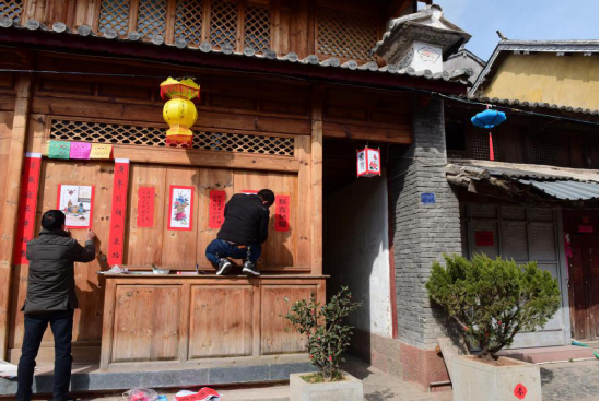 寫春聯(lián)繪年畫的傳統(tǒng)在劍川縣金華鎮(zhèn)由來已久,明朝洪武年間改土歸流和移民屯邊制度的推行,使儒家文化、理學(xué)思想逐漸融入邊疆人民的生活。金華古鎮(zhèn)居民受此影響,走上追求仕途功名的道路,文人鄉(xiāng)紳都以顯示儒學(xué)身份為榮。每逢春節(jié),人們會(huì)邀請(qǐng)有功名的仕子或傳學(xué)明經(jīng)的文人來到家中,撰寫對(duì)聯(lián),同時(shí)根據(jù)時(shí)令畫上一兩幅門神畫,希望通過此舉祈愿自家后生求得功名。如今走在金華古鎮(zhèn)西門街上,仍能看到家家種花養(yǎng)草,戶戶楹聯(lián)盈門,一派文風(fēng)蔚然的生機(jī)。