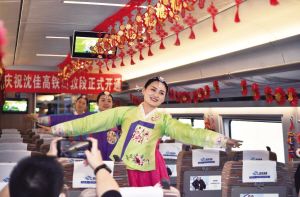 沈佳高鐵長白山至敦化段開通運(yùn)營,將促進(jìn)沿線旅游業(yè)和冰雪經(jīng)濟(jì)快速發(fā)展,進(jìn)一步加強(qiáng)民族團(tuán)結(jié),助力長吉圖開發(fā)開放、深度融入 “一帶一路”。圖為列車工作人員在車內(nèi)表演朝鮮族歌舞。 新華社發(fā)