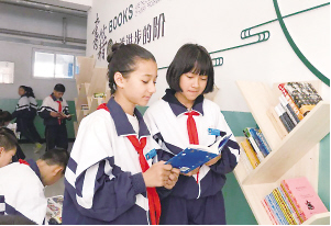 澤普縣五中學(xué)生在讀書角閱讀書籍。