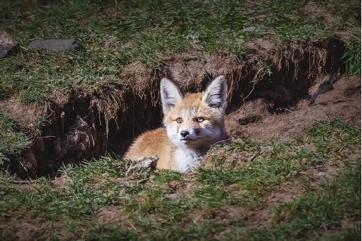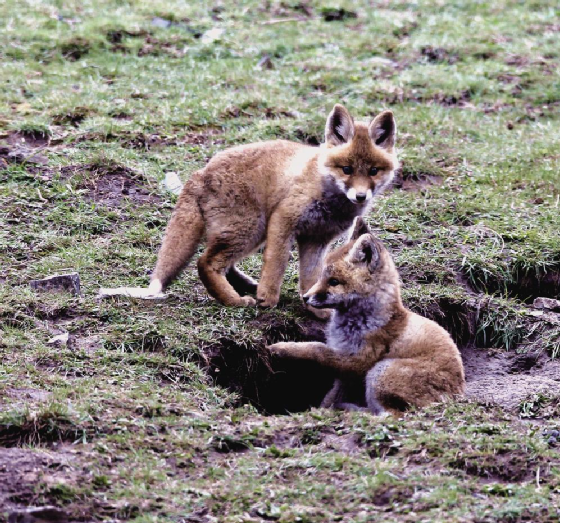 藍(lán)天白云,微風(fēng)輕漾;草地碧綠,鳥語花香。大自然的美景圖正在小赤狐的家園四周徐徐展開。在膽大的小赤狐的叫喚聲里,躲在洞內(nèi)的另外兩只小赤狐也壯著膽子探出頭來。不一會兒,它們習(xí)慣了周圍的環(huán)境,三只小赤狐在離洞口5米遠(yuǎn)的范圍內(nèi)嬉戲玩耍著。它們時而跳躍,時而奔跑,展現(xiàn)出本能的捕獵動作。稍大一點的小赤狐騎在小一點赤狐的背上嬉戲玩耍,小赤狐也不示弱,奮力反擊,猶如兒童打鬧,其樂無窮。那烏黑溜圓的眼睛彎了又彎,毛茸茸的尾巴高高地翹起,身體嬌小,惹人喜愛,讓人看了會產(chǎn)生想上去抱一抱、摸一摸小赤狐身軀的念頭。