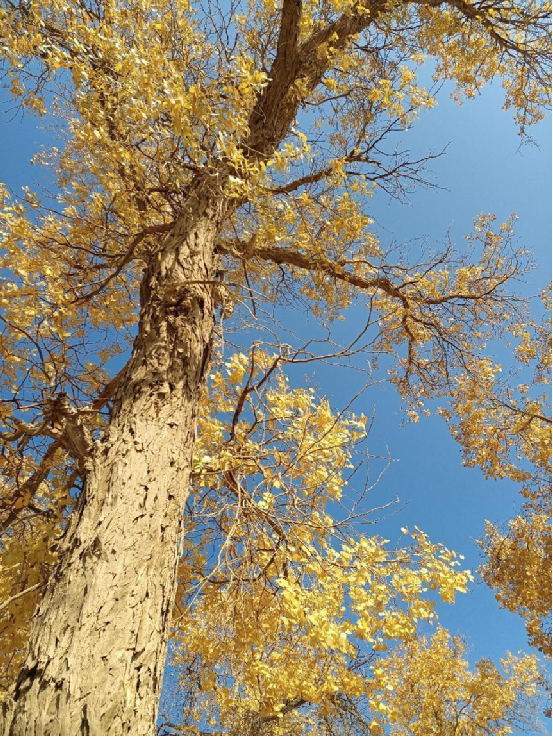 每當(dāng)深秋季節(jié),胡楊樹葉變得一片金黃,形成胡楊秋色,樹影婆娑,奇妙絕倫,賞心悅目。漫步在濃郁的胡楊林中仿佛進(jìn)入神話般的仙境。茂密的胡楊千奇百怪,神態(tài)萬般。粗壯的幾人難以合抱,挺拔的七、八丈之高,怪異的似蒼龍騰越,似虬蟠狂舞,令人驚奇不已,嘆為觀止。僅就密密匝匝的樹葉,也是風(fēng)采獨(dú)有。幼小的胡楊,葉片狹長而細(xì)小,宛若少女嫵媚的柳眉,人們常常把它誤認(rèn)為柳樹;壯齡的胡楊,葉片又變成卵形、闊卵形或三角形,猶如興安嶺的白樺;進(jìn)入老年期的胡楊,葉片才定型為橢圓形。更令人稱奇者,在同一棵胡楊樹冠的上下層次,還長著不同形狀的葉片,因此,又稱“異葉楊”