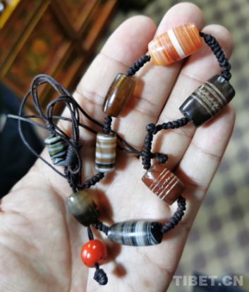 在藏語中,天珠被稱為“瑟”。在普蘭邊貿(mào)市場中,并不是所有的商家都有天珠。但凡是有上好天珠的商家,必有很大的吸引力。在市場中,他們也充滿自信。我在市場中走訪了多家有天珠的商店,并簡要總結(jié)了多數(shù)商家對天珠的認(rèn)定標(biāo)準(zhǔn)。在尼泊爾商家的眼中,天珠的質(zhì)量要看幾個(gè)方面。一是“石頭”的質(zhì)量,上好的“石質(zhì)”是好天珠的必要條件。他們在檢驗(yàn)時(shí),多用門牙上下撞擊天珠的不同位置,便可以分辨出天珠料子的好壞。在那里,我也遇到了幾位買天珠的僧人,其辨別過程中也使用了這樣的方法。二是包漿程度,一顆好天珠就要有相應(yīng)的歲月的痕跡,而包漿就是歲月長短的最重要的代表。當(dāng)然,這也并非絕對,因?yàn)榘鼭{的形成主要依靠人為的把玩,那些沒有相應(yīng)包漿但達(dá)到上千年的天珠在他們眼中依然很快便會被識別出。在尼泊爾的茶館中,一位當(dāng)?shù)氐牟刈迦罕娤蛭医榻B了一顆天珠,據(jù)說有人曾用成都的一套房子來換,但并未打動(dòng)主人,那顆珠子擺在我的面前,沒有所謂的包漿,但歲月形成的厚重感卻十分明顯。三是天珠的孔道,因?yàn)榭椎酪彩菤q月的見證者,一般孔道越是圓潤便越具有價(jià)值。