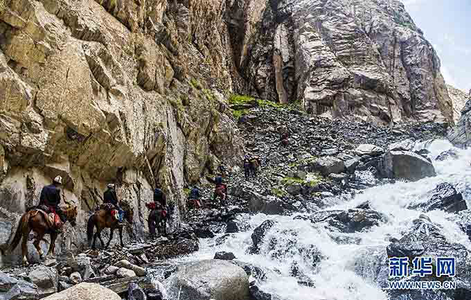 喀拉塔什其木干村村民馱隊(duì)沿著崎嶇的山路前往夏牧場
