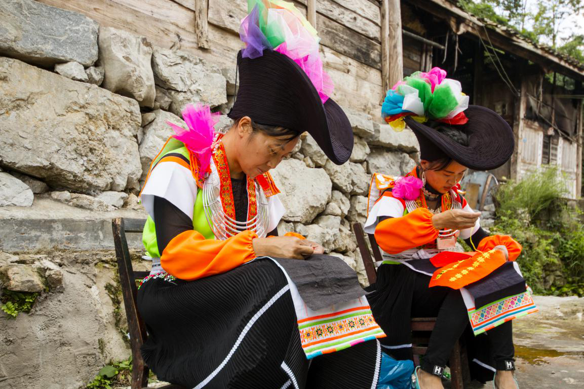 女子服飾腰間的腰帶,會(huì)連綴珠簾,給服飾整體添光加彩,使服飾整體看上去更加鮮艷亮麗。批林村人不只是在傳統(tǒng)節(jié)日當(dāng)中會(huì)穿著傳統(tǒng)服飾,在日常生活中也會(huì)穿戴象征本民族的傳統(tǒng)服飾。批林村傳統(tǒng)服飾上的圖案,都來(lái)源于自己的刺繡。批林村女子刺繡圖案的多少和優(yōu)美與否,在一定程度上,標(biāo)識(shí)了苗族婦女的勤勞能干,所以批林村苗族女子的刺繡圖案復(fù)雜變化,集優(yōu)美與實(shí)用一體,繡在傳統(tǒng)衣服上,顯得典雅大氣。傳統(tǒng)的刺繡一針一線,一穿一引,將處理好的麻布繡以幾何、花朵等圖案,以針線的方式賦予了苗族衣飾鮮活的生命力。