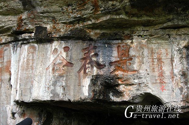 “是春谷”摩崖長20米,高3米,約2萬余字,名為《洗心泉集》,從經(jīng)史集成的詩章共46首,670佘行。所集之書包括易、書、詩、春秋、三禮、四書、孝經(jīng)、爾雅、楚辭、漢、魏、晉、劉宋、南齊、北、周、隋、唐、五代、宋、金、遼、元、明以及時(shí)賢黔宦,黔人等各時(shí)代著名書籍。每字約4,5厘米見方,歐體楷書工整秀麗,為貴州摩崖上乘之作?!鞍灼r春流環(huán)谷水,青山高詠屬宣城?!庇紊酵嫠g,詠此詩句,別有韻味。
